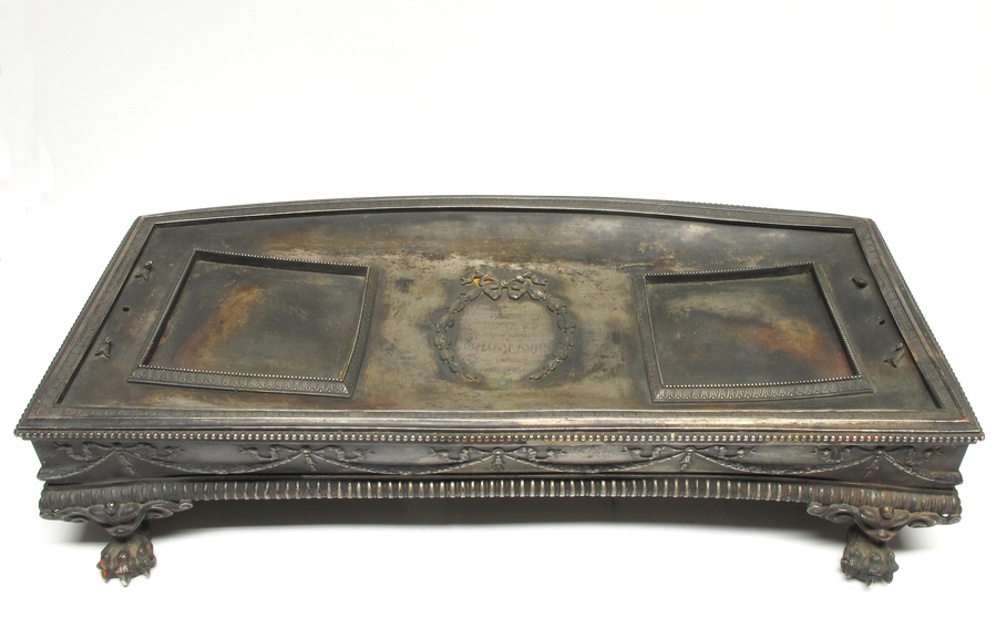 Дарственная надпись и дата свидетельствуют, что изысканный чернильный прибор был подарен Янке Купале его коллегами из Института белорусской культуры – знаменитого научно-исследовательского учреждения, основанного в 1922 г. и в 1928 г. реорганизованного в Белорусскую академию наук. Янка Купала был одним из создателей Инбелкульта, возглавлял Гуманитарную секцию, стал академиком Белорусской академии наук. Подарок сделан к 20-летию творческой деятельности, отсчет которой шел от первого выступления поэта в печати – публикации стихотворения «Мужик» на страницах минской газеты «Северо-Западный край» в мае 1905 г.