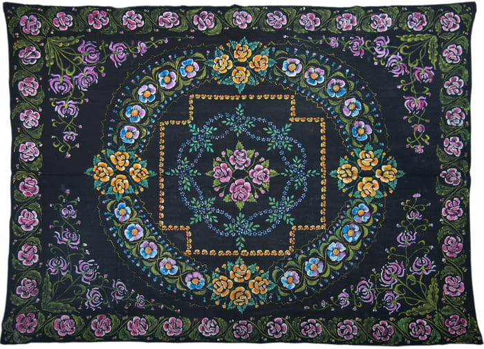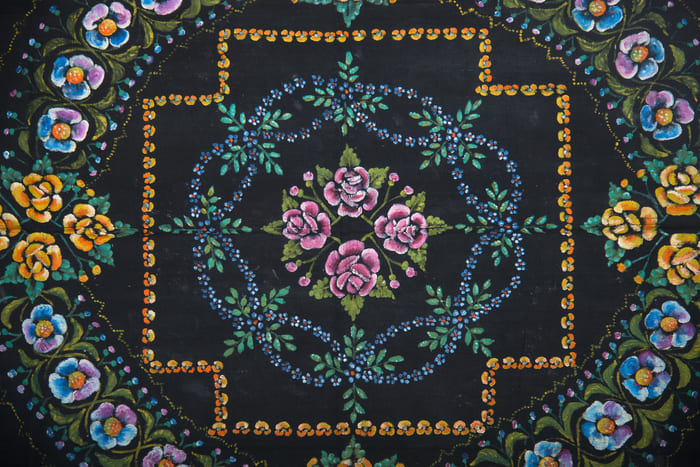 Расписные ковры по декору и характеру композиции сходны с вышитыми и ткаными настенными декоративными коврами. Но они были дешевле и менее трудоемки. Состояли из двух сшитых кусков домашнего льняного полотна, окрашенного в черный цвет, затем на нем прорисовывались основные детали сюжета, иногда с помощью трафаретов, вырезанных из картона. Подрисовка мелких деталей и теней наносились вручную.